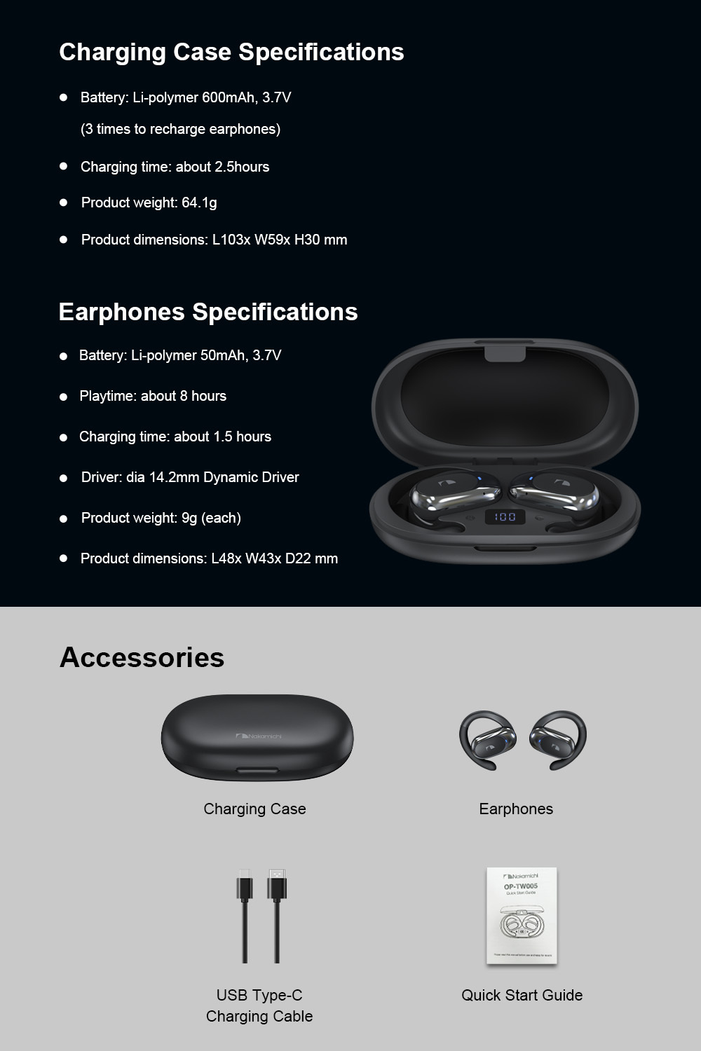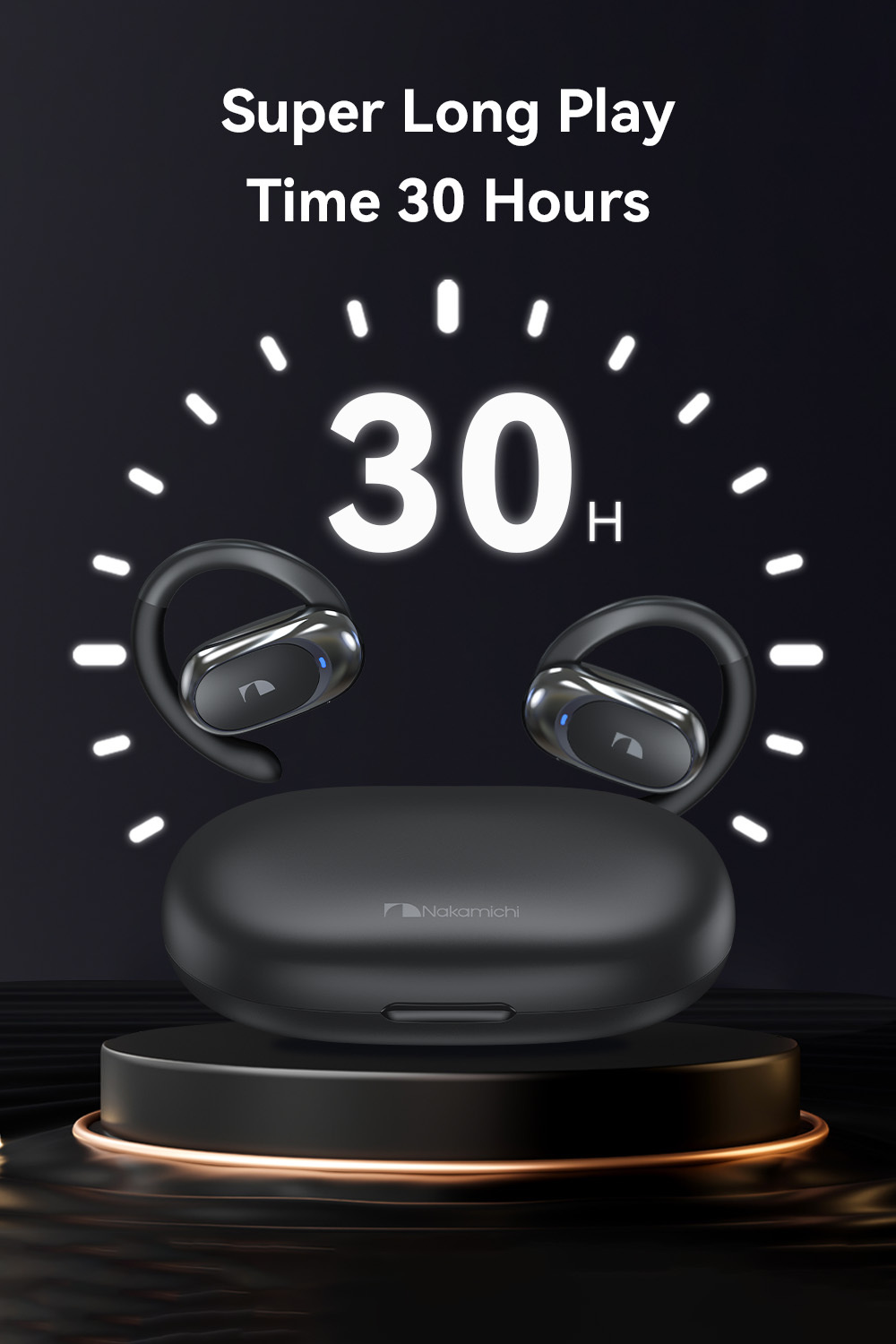 - Long play time up to 30 hours (with charging case)