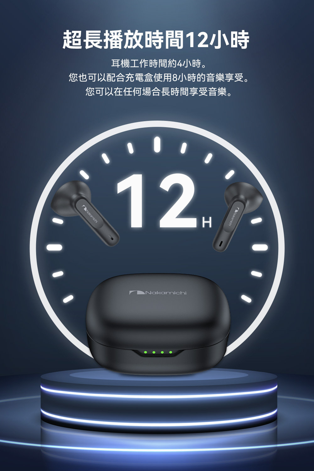 - 長達12小時的超長播放時間(帶充電盒)