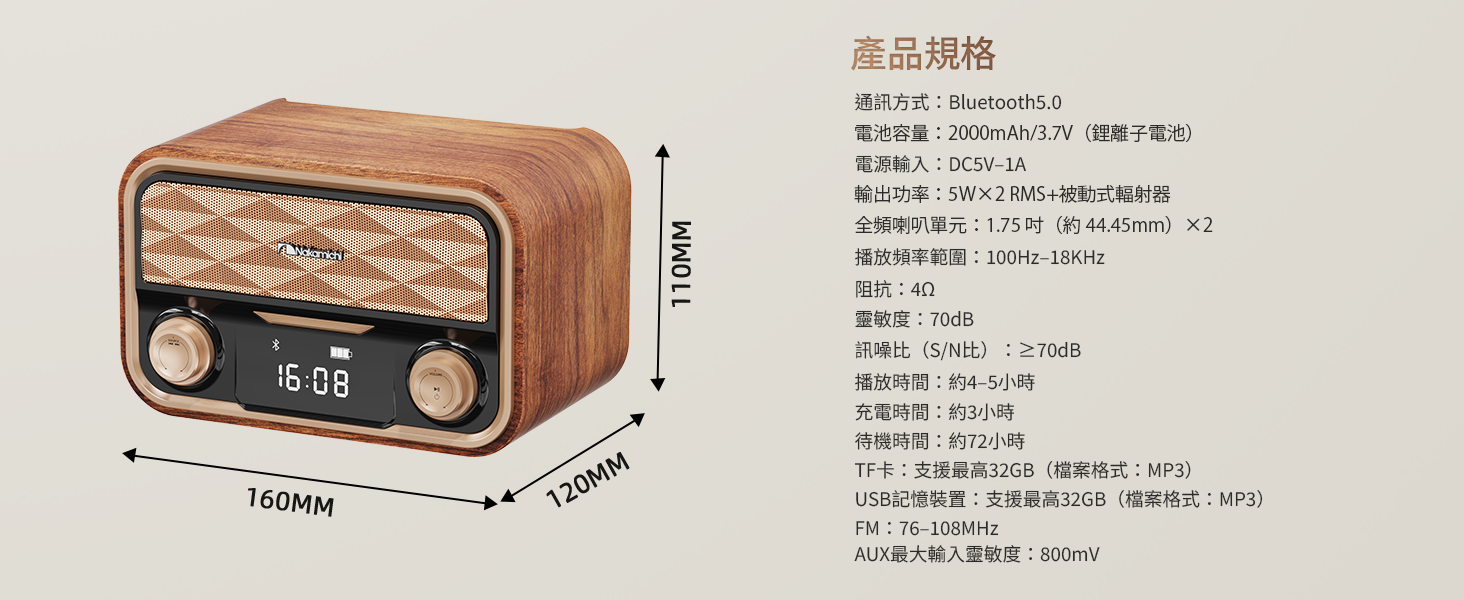 - 內置FM(87.5-108MHz)